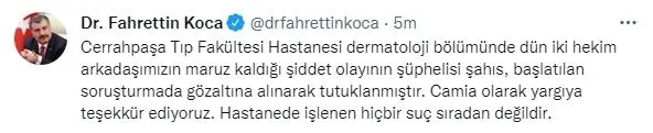 Sağlık Bakanı Fahrettin Koca paylaşımında: "Cerrahpaşa Tıp Fakültesi Hastanesi dermatoloji bölümünde dün iki hekim arkadaşımızın maruz kaldığı şiddet olayının şüphelisi şahıs, başlatılan soruşturmada gözaltına alınarak tutuklanmıştır. Camia olarak yargıya teşekkür ediyoruz. Hastanede işlenen hiçbir suç sıradan değildir." ifadelerini kullandı.