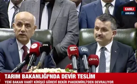 Son dakika bilgisine göre Tarım ve Orman Bakanlığı'nda devir teslim töreni gerçekleşti. Yeni bakan Vahit Kirişçi, görevi Bekir Pakdemirli'den devraldı. Bakan Kirişçi Tarım Bakanlığı'nda daha önce mühendis olarak görev yaptığını hatırlattı ve Bakanlıkla yakın ilişkide olduğunu belirtti.