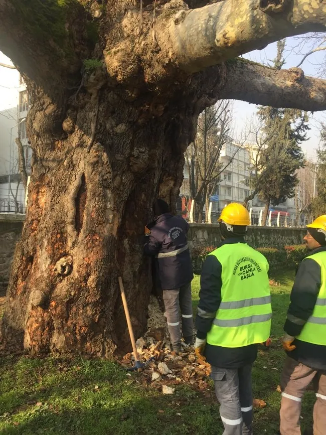 BURSA'DAKİ 433 YAŞINDAKİ TARİHİ ÇINARIN BAKIMI YAPILIYOR