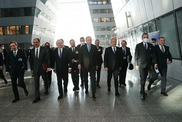 Başkan Recep Tayyip Erdoğan, NATO Olağanüstü Devlet ve Hükümet Başkanları Zirvesi'ne katılmak ve ikili temaslarda bulunmak üzere geldiği Brüksel'de Türkiye'nin NATO Daimi Temsilcisi Basat Öztürk tarafından karşılandı. Karşılamada AB Daimi Temsilcisi Mehmet Kemal Bozay, Brüksel Büyükelçisi Hasan Ulusoy, Türk Askeri Temsil Heyeti Başkanı Tümgeneral İsmail Üner, Brüksel Başkonsolosu Umut Deniz, Anvers Başkonsolosu Batu Kesmen, Askeri Ataşe Albay Çağrı Sağıroğlu, Uluslararası Demokratlar Birliği (UID) Genel Başkanı Köksal Kuş, UİD Belçika Başkanı Enis Çimen ile AK Parti Brüksel Temsilcisi Ruhi Açıkgöz ve diğer yetkililer de hazır bulundu. Başkan Erdoğan ile eşi Emine Erdoğan ile birlikte Dışişleri Bakanı Mevlüt Çavuşoğlu, Milli Savunma Bakanı Hulusi Akar, AK Parti Genel Başkan Yardımcısı ve Parti Sözcüsü Ömer Çelik, NATO Parlamenter Asamblesi Türk Delegasyonu Başkanı, AK Parti Rize Milletvekili Osman Aşkın Bak, Cumhurbaşkanlığı İletişim Başkanı Fahrettin Altun ve Cumhurbaşkanlığı Sözcüsü İbrahim Kalın da Brüksel'e geldi.