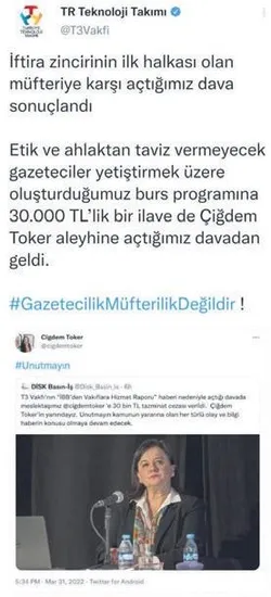 Karar sonrası T3 Vakfı tarafından yapılan açıklamada, "İftira zincirinin ilk halkası olan müfteriye karşı açtığımız dava sonuçlandı. Etik ve ahlaktan taviz vermeyecek gazeteciler yetiştirmek üzere oluşturduğumuz burs programına 30.000 TL'lik bir ilave de Çiğdem Toker aleyhine açtığımız davadan geldi" denildi. T3 Vakfı Mütevelli Heyeti Başkanı Selçuk Bayraktar ise, "Yalancının mumu yatsıya kadar yanar. Bu, 2019 yerel seçim döneminde vakfımız aleyhine başlatılan kirli kampanyayı ve İBB'den para aldığı yalanını ilk yayan gazeteci müsveddesi. Gazetecilik; yalancılık, sahtekârlık, yüzsüzlük, arsızlık da değildir" paylaşımında bulundu.
