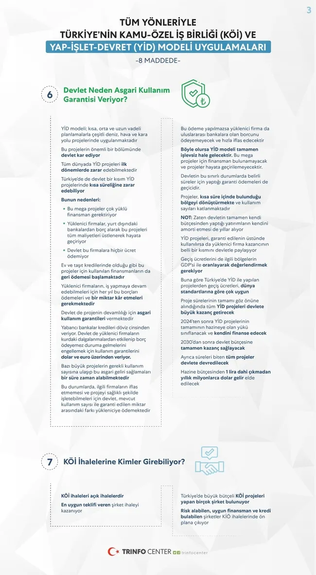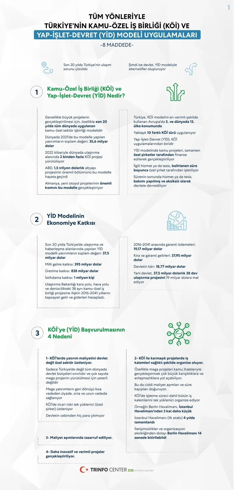 Türkiye'de muhalefet başta CHP Genel Başkanı Kemal Kılıçdaroğlu olmak üzere Yap-İşlet-Devret modeli ile ilgili çeşitli spekülasyonlar ortaya atıyor. Peki muhalefetin iddia ettiği gibi, 'Yap İşlet Devret modeli'nde devlet zarara mı uğratılıyor? Birileri zengin mi ediliyor? projeler kullanılmıyor mu? İşte 8 maddede yap işlet devret modeli gerçeği...