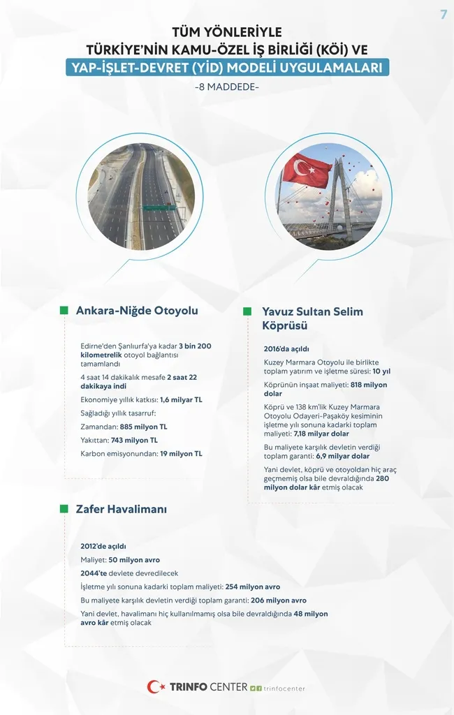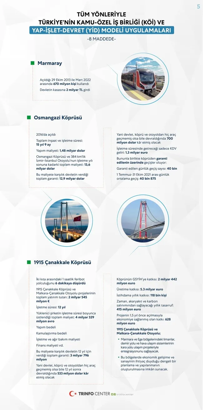 Amerika 1,5 trilyon dolarlık altyapı projesinin önemli bölümünü bu modelle hayata geçirmiştir. Ülkemiz ulaştırma ve haberleşme alanında bu modelle 37,5 milyar dolarlık yatırıma kavuşmuştur. Bay Kemal bak bunları milli bütçeden yapmadık. Yapılan analizler 2024 yılında kamu özel ortaklığı projelerinin Hazine'ye olan yükünün neredeyse sıfırlanacağını, bir sonraki yıllar itibarıyla katlanarak artan bir gelire dönüşeceğini gösteriyor. Yatırımın devreye girdiği andan itibaren devletin vergi, zaman, akaryakıt bu noktada tabii akaryakıt tasarrufu başta olmak üzere elde ettiği gelirler kamunun kâr hanesine yazılmaya başlamaktadır. Hayata geçirilen yatırımların milli gelire 295 milyar dolar, üretime 838 milyar dolar, istihdama 1 milyon kişi katkısı zaten olmuştur. Bu katkı her geçen gün artarak sürecek, yapılan eserler devlete geçecektir.