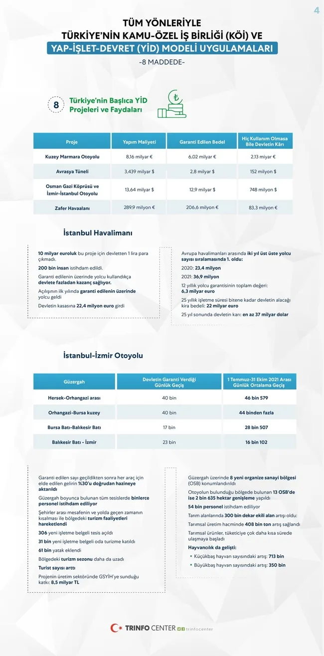 Başkan Recep Tayyip Erdoğan, geçtiğimiz günlerde Kabine Toplantısı'nın ardından muhalefetin eleştirdiği 'Yap-İşlet-Devret' modelinin katkılarından bahsetmişti. Erdoğan, "Hayata geçirilen yatırımların milli gelire 295 milyar dolar, üretime 838 milyar dolar, istihdama 1 milyon kişi katkısı zaten olmuştur." ifadelerini kullandı.