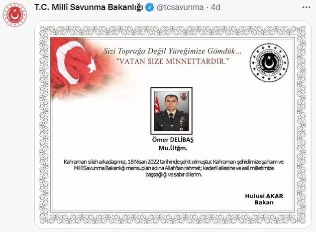 Bakan Akar'ın Milli Savunma Bakanlığının Twitter hesabından paylaşılan mesajında, "Kahraman silah arkadaşımız, 18 Nisan 2022 tarihinde şehit olmuştur. Kahraman şehidimize şahsım ve Milli Savunma Bakanlığı mensupları adına Allah'tan rahmet; kederli ailesine ve asil milletimize başsağlığı ve sabır dilerim" ifadelerine yer verildi.
