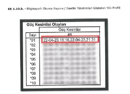 "O gün sadece sizin ziyaret saatlerinizi de kapsayan 18:18 ile 21:31 saatleri arasında elektrik tüketimi yoktur. Ziyaretinizin ardından 21:31'den itibaren elektrik kullanımına devam edilmiştir."