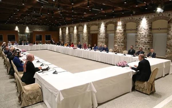 Cumhurbaşkanlığı Dolmabahçe Ofisi'ndeki kabule, Cumhurbaşkanı Yardımcısı Fuat Oktay, Cumhurbaşkanlığı İletişim Başkanı Fahrettin Altun, TÜRGEV Yönetim Kurulu Başkanı Fatmanur Altun, İlim Yayma Vakfı Mütevelli Heyeti Başkanı Bilal Erdoğan ile sivil toplum kuruluşu yöneticileri katıldı.