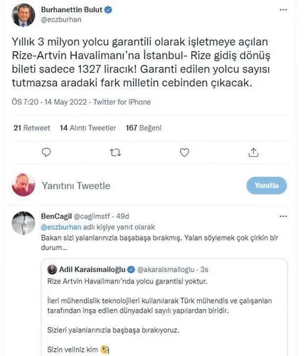 Ağbaba'nın attığı mesajı gören CHP'li vekiller de hemen klavyeye sarılarak yalanın üzerine atladı. CHP Adana Milletvekili Burhanettin Bulut, sosyal medya hesabından, "Yıllık 3 milyon yolcu garantili olarak işletmeye açılan Rize- Artvin Havalimanı'na İstanbul- Rize gidiş dönüş bileti sadece 1.327 liracık! Garanti edilen yolcu sayısı tutmazsa aradaki fark milletin cebinden çıkacak" dedi.