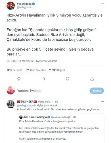 Rize-Artvin Havalimanı’nın “3 milyon yolcu garantisi olduğu” yalanını ortaya atan CHP Genel Başkan Yardımcısı Veli Ağbaba, diğer CHP’li vekilleri de trolledi. Ağbaba’nın yalan balonu Bakan Karaismailoğlu’nun açıklamasıyla elinde patladı