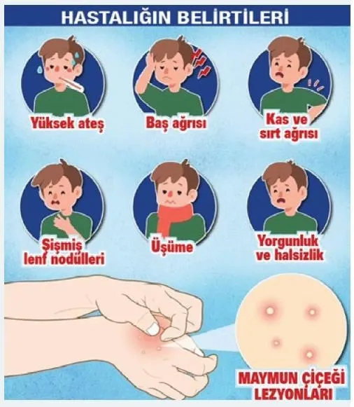 Ateş, baş ağrısı, yorgunluk, yaygın vücut ağrıları, lenf bezlerinde şişlik ve ciltte döküntü, lenf bezi şişliği, maymun çiçeğini su çiçeği ve kızamıktan ayıran en önemli belirtiler. Yakınmalar, virüsle temastan ortalama 6-13 gün sonra ortaya çıkıyor. İlk 5 gününde ateş, şiddetli baş ağrısı, lenf bezlerinde şişme, sırt ağrısı ve aşırı halsizlik yaşanan hastalıkta, ciltteki döküntüler de ateş başladıktan sonra 1-3 gün içinde görülüyor. Ateş arttıkça vücutta bir kızarıklık ve kaşıntı oluşmaya başlıyor. Genelde yüzde başlıyor ve daha sonra vücudun başka noktalarına ulaşıyor. Avuç içinde ve ayakların tabanlarında yaygın bir şekilde ortaya çıkıyor. Kaşıntı aşırı derecede rahatsız edici ya da acı verici olabiliyor. Kaşıntı geçtikten sonra ayak tabanları ve avuç içindeki yaralar önce kabuk bağlıyor, daha sonra kuruyarak geçiyor.