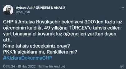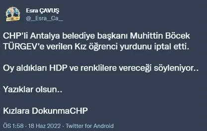 CHP'li Antalya Büyükşehir Belediyesi, mülkiyeti kendi ait olan ve 49 yıllığına TÜRGEV'e verilen Kepez'deki kız öğrenci yurt binası ile İlim Yayma Cemiyeti'ne verilen Muratpaşa'daki öğrenci yurdu binalarını geri aldı. Sosyal medyada yurdun HDP'ye yakın bir kuruluşa tahsis edileceği iddia edildi. Antalya'nın eski Büyükşehir Belediye Başkanı Menderes Türel zamanında irtifak hakkı bedelsiz olarak 49 yıllığına iki kuruma verilen yurt binaları Antalya Büyükşehir Belediye Meclisi'nin yeni oy çokluğuyla aldığı yeni kararla belediyenin kullanımına geçti. Oylamanın ardından açıklama yapan Antalya Büyükşehir Belediye Başkanı Muhittin Böcek, öğrenciler için açtıkları yurtlara kira ödediklerini söyleyerek, "Sayıştay incelemesinde 'Senin kendi yurt binaların varken, neden bu kirayı ödüyorsun' diyor" dedi.