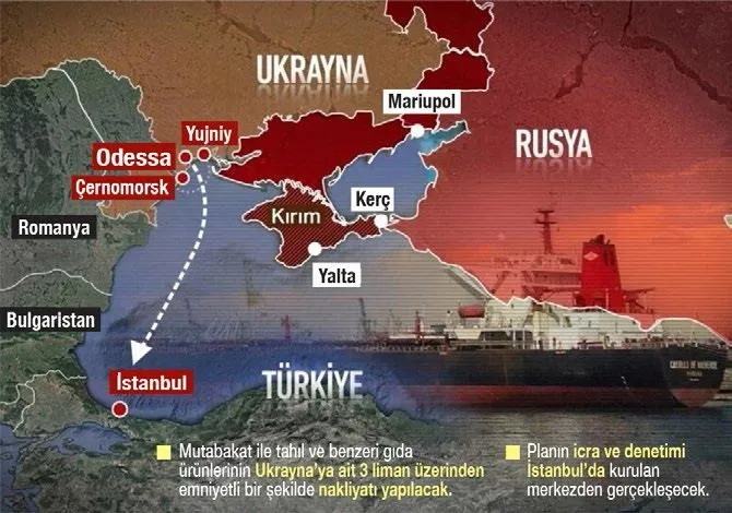 Dünyaya nefes aldıracak tahıl yolculuğunun yönetileceği Müşterek Koordinasyon Merkezi, İstanbul'da göreve başladı. Milli Savunma Üniversitesi'ndeki merkez, Ukrayna limanlarından çıkan tahıl yüklü gemilerin tüm hareketlerini anbean takip edecek Tahıl yüklü gemiler Karadeniz üzerinden İstanbul'a gelecek. Türkiye'nin denetiminde dünyaya ihracatı yapılacak. İlk geminin 2 hafta içerisinde hareket etmesi beklenirken, 20 milyon ton tahıl dünyaya ulaşacak