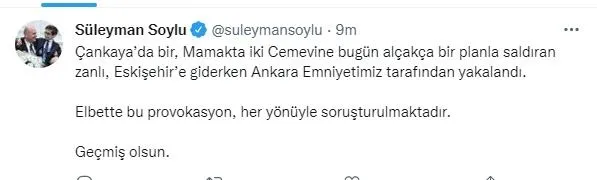 Sosyal medya hesabından açıklama yapan Bakan Soylu konuyla ilgili şu ifadeleri kullandı: Çankaya'da bir, Mamakta iki Cemevine bugün alçakça bir planla saldıran zanlı, Eskişehir'e giderken Ankara Emniyetimiz tarafından yakalandı. Elbette bu provokasyon, her yönüyle soruşturulmaktadır.