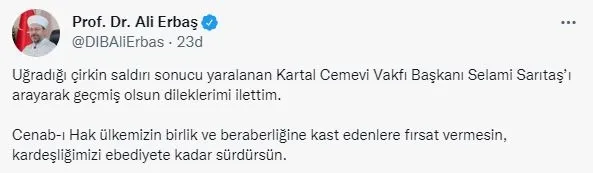 Diyanet İşleri Başkanı Ali Erbaş, saldırıya uğrayan Kartal Cemevi Vakfı Başkanı Selami Sarıtaş'ı telefonla arayarak "geçmiş olsun" dileğinde bulundu.