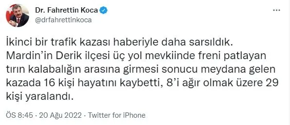 Yeni bir paylaşım daha yapan Bakan Koca, ölü sayısının 19'a yükseldiğini berlirtti. Koca, "Mardin Derik'te bir tırın kalabalığın arasına girmesi ile meydana gelen kazada hayatını kaybedenlerin sayısı maalesef 19'a yükseldi. 6'sının durumu ağır olmak üzere yaralı sayısı 26'dır. Hayatını kaybedenlere Allah'tan rahmet, tedavisi süren hastalarımıza acil şifalar diliyorum." ifadelerini kullandı.