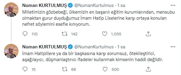 Şarkıcı Gülşen'in İmam Hatip Liseleri için kullandığı hadsiz ifadelere tepki gösteren AK Parti Genel Başkanvekili Numan Kurtulmuş sosyal medya hesabından şu ifadeleri kullandı: Milletimizin gözbebeği, ülkemizin en başarılı eğitim kurumlarından, mensubu olmaktan gurur duyduğumuz İmam Hatip Liselerine karşı ortaya konulan nefret söylemini esefle kınıyorum. İmam Hatiplilere ya da bir başkasına karşı sorumsuz, ötekileştirici, aşağılayıcı, düşmanlaştırıcı ifadeler kullanmak kimsenin haddi değildir.