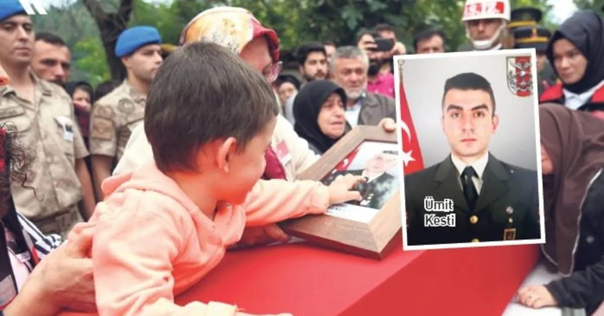 Helikopter kazasında şehit olan Uzman Çavuş Ümit Kesti, Ordu’da toprağa verdi. 2 yaşındaki oğlu, fotoğrafına sarılarak babasına veda etti