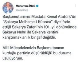 Öte yandan, gafı sosyal medya hesabından yorumlayan Memleket Partisi lideri Muharrem İnce, "Başkomutanımız Mustafa Kemal Atatürk'ün 'Sakarya Melhame-i Kübrası' diye ifade ettiği Sakarya Zaferi'nin 101. yıldönümünde Sakarya Nehri ile Sakarya kentini karıştırmak anlık bir gaf değildir. Milli mücadelemizin başkomutanının kurduğu partinin düşürüldüğü bu duruma üzülüyorum" paylaşımında bulundu. İHA