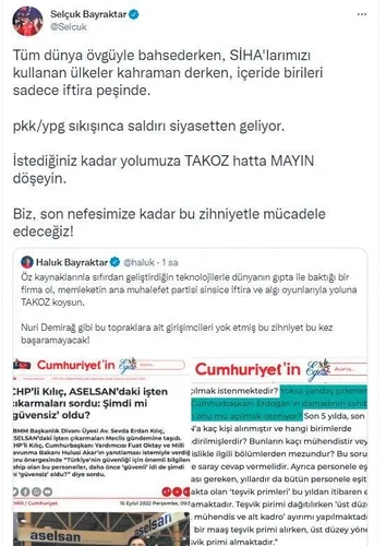 Cumhuri yet Gazetesi, CHP İzmir Milletvekili ve TBMM Başkanlık Divanı Üyesi Av. Sevda Erdan Kılıç'ın "ASELSAN'ın liyakatli personelleri gönderilerek kurumun içi boşaltılıyor" iddiası için soru önergesinde yer alan "Yoksa yandaş şirketlerin; örneğin Cumhurbaşkanı Erdoğan'ın damadının sahibi olduğu Baykar'ın önü mü açılmak isteniyor?" sorusuna haberinde yer verdi. TEKNOFEST Yönetim Kurulu Başkanı, Baykar Teknoloji Lideri, T3 Vakfı Mütevelli Heyeti Başkanı Selçuk Bayraktar ve Baykar Teknoloji CEO'su Haluk Bayraktar, CHP'nin iftira peşinde olduğunu ifade ederek sosyal medyadan CHP'yi yalanladı. İşte o açıklamalar: Cumhuriyet Gazetesi, CHP İzmir Milletvekili ve TBMM Başkanlık Divanı Üyesi Av. Sevda Erdan Kılıç'ın "ASELSAN'ın liyakatli personelleri gönderilerek kurumun içi boşaltılıyor" iddialarını haberleştirdi. Cumhurbaşkanı Yardımcısı Fuat Oktay ve Milli Savunma Bakanı Hulusi Akar'ın yanıtlaması istemiyle TBMM Başkanlığı'na soru önergesi veren Kılıç'ın sorularının da yer aldığı haberde şu soruya da yer verildi: "Yoksa yandaş şirketlerin; örneğin Cumhurbaşkanı Erdoğan'ın damadının sahibi olduğu Baykar'ın önü mü açılmak isteniyor?" Baykar Teknoloji CEO'su Haluk Bayraktar, Cumhuriyet'in bu haberini sosyal medya hesabından paylaşarak CHP'yi yalanlarken çok sert bir şekilde yanıt verdi. Haluk Bayraktar sosyal medya hesabından "Özkaynaklarınla sıfırdan geliştirdiğin teknolojilerle dünyanın gıpta ile baktığı bir firma ol, memleketin ana muhalefet partisi sinsice iftira ve algı oyunlarıyla yoluna TAKOZ koysun. Nuri Demirağ gibi bu topraklara ait girişimcileri yok etmiş bu zihniyet bu kez başaramayacak" dedi.