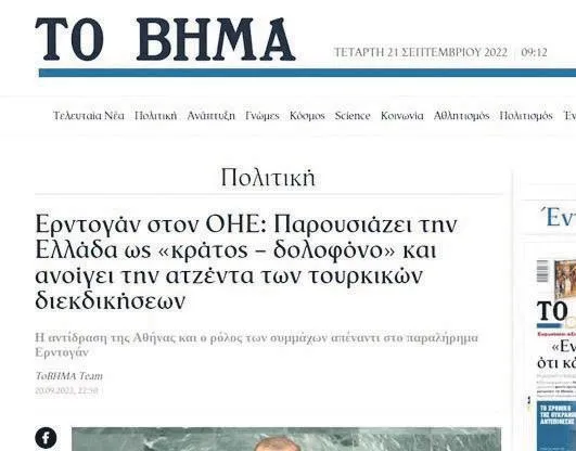 Yunan 'To Vima' gazetesi, "Erdoğan BM'de: Yunanistan'ı 'katil bir devlet' olarak sunuyor" başlığı ile okurlarına sunduğu haberde, Başkan Erdoğan'ın "Yunanistan Ege'yi mülteci mezarlığına dönüştürüyor " sözlerine yer verdi. CNN Greece ise Erdoğan'ın 'Yunanistan'ı insanlık suçlarıyla itham edilen konuma getirmeye çalıştığını' öne sürdü. Ta Nea, Başkan Erdoğan'ın Ege ve Doğu Akdeniz'deki gerilimi tırmandıran tek tarafın Yunanistan olduğunu belirttiğini yazdı.