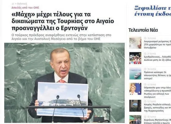 Başkan Erdoğan'ın haklarını her zaman sonuna kadar savunacağını ve diğer ülkelerden gelen tırmanma stratejilerine boyun eğmeyeceğini açıkladığı belirtildi. Kathimerini de hadsiz bir dille 'Erdoğan Yunanistan'a saldırmak için BM'yi kullandı' başlığını attı.