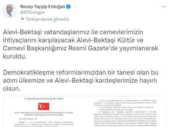Cumhurbaşkanı Erdoğan, sosyal medya hesabından, "Alevi- Bektaşi vatandaşlarımız ile cemevlerimizin ihtiyaçlarını karşılayacak Alevi-Bektaşi Kültür ve Cemevi Başkanlığımız Resmi Gazete'de yayımlanarak kuruldu. Demokratikleşme reformlarımızdan bir tanesi olan bu adım, ülkemize ve Alevi-Bektaşi kardeşlerimize hayırlı olsun" paylaşımında bulundu.