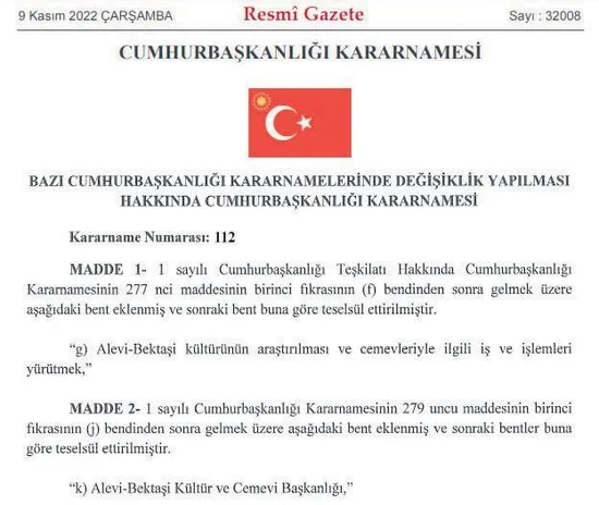 Kültür ve Turizm Bakanlığı bünyesinde “Alevi-Bektaşi Kültür ve Cemevi Başkanlığı” kurulmasına ilişkin Cumhurbaşkanlığı kararnamesi, Resmi Gazete’de yayımlandı. Kararnameyle Alevi-Bektaşi Kültür ve Cemevi Başkanlığı kuruldu. Başkan ve 11 üyeli Danışma Kurulu kurulacak