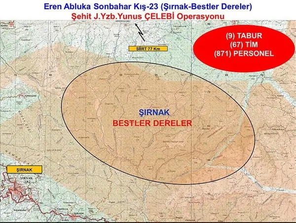 Şırnak'ın Bestler-Dereler bölgesinde 'Eren Abluka Sonbahar Kış-23 Operasyonu' başlatıldı. Operasyon kapsamında komandolar helikopterle stratejik noktalara indirme yaptı. PKK terör örgütünü ülke gündeminden çıkarmak ve bölgede barındığı değerlendirilen teröristleri etkisiz hale getirmek amacıyla Şırnak'ta 'Eren Abluka Sonbahar Kış-23 Bestler Dereler Şehit Jandarma Yüzbaşı Yunus Çelebi Operasyonu'na start verildi.
