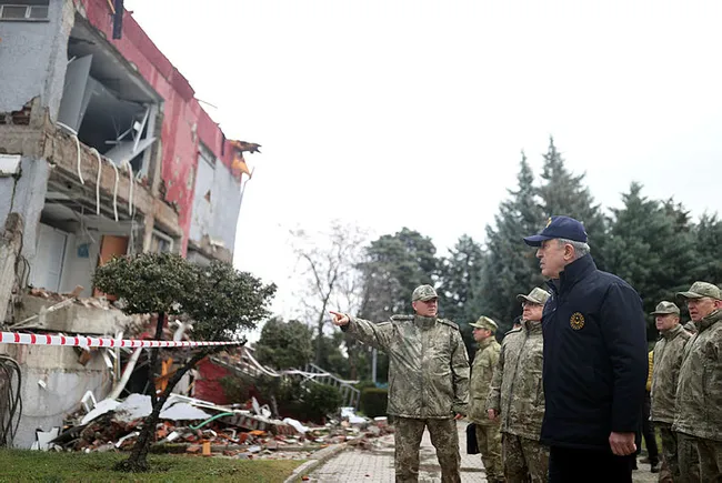 Akar beraberinde Genelkurmay Başkanı Orgeneral Yaşar Güler ve Kara Kuvvetleri Komutanı Orgeneral Musa Avsever ile Hatay'da deprem bölgesindeki çalışmalarını sürdürüyor.