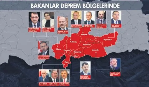 Deprem yaşanan illere devlet tüm kurum ve yetkilileriyle çıkarma yaptı. İçişleri Bakanı Süleyman Soylu K.Maraş'a; Milli Savunma Bakanı Hulusi Akar, Sağlık Bakanı Fahrettin Koca, Tarım ve Orman Bakanı Vahit Kirişci Hatay'a; Çevre ve Şehircilik Bakanı Murat Kurum Gaziantep'e, Gençlik ve Spor Bakanı Mehmet Kasapoğlu Osmaniye'ye, Ulaştırma Bakanı Adil Karaismailoğlu Adıyaman'a, Kültür ve Turizm Mehmet Nuri Ersoy ve Milli Eğitim Bakanı Mahmut Özer Malatya'ya; Adalet Bakanı Bekir Bozdağ Diyarbakır'a; Hazine ve Maliye Bakanı Nureddin Nebati Şanlıurfa'ya, Enerji ve Tabii Kaynaklar Bakanı Fatih Dönmez ile Aile ve Sosyal Hizmetler Bakanı Derya Yanık Adana ve Osmaniye'ye; Ticaret Bakanı Mehmet Muş Kilis'e gitti.