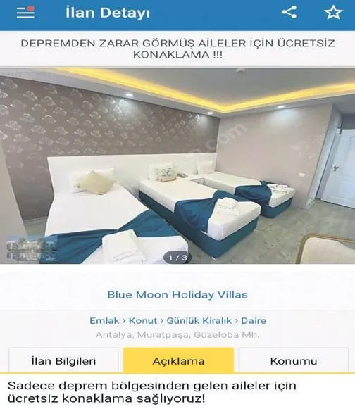 Kemer ilçesinde 2+1 bir evi bulunan kişi, yayınlandığı ilanda, "Duygularım karışık, hiçbir şey yapamamak bizi derinden üzüyor. Kalabalık cümleler yazmak istemiyorum. Sizin için hazırladık. Problemlerini aşana kadar elimizden geleni yapmaya hazırız. İki aile rahat kalabilir" sözlerine yer verdi.
