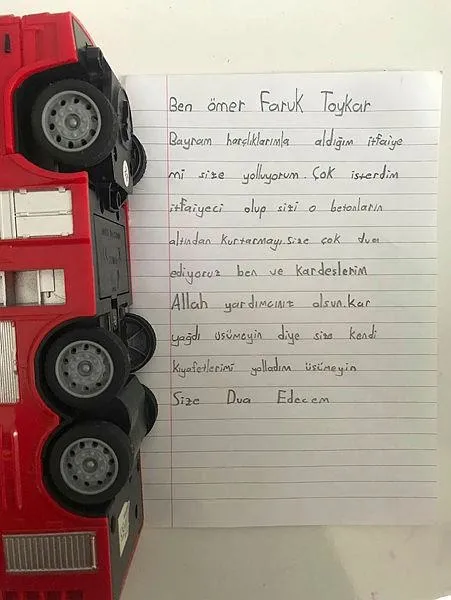Bir çocuğun yazdığı notta, "Ben Ömer Faruk Toykar, bayram harçlıklarımla aldığım itfaiyemi size yolluyorum. Çok isterdim itfaiyeci olup sizi o betonların altından kurtarmayı. Size çok dua ediyoruz ben ve kardeşlerim" ifadeleri yer aldı.