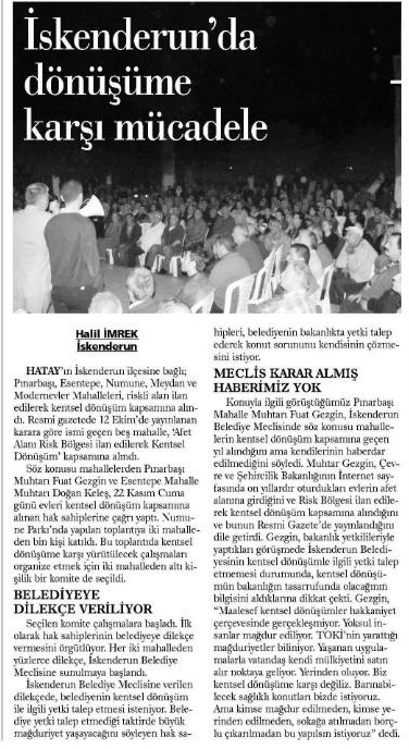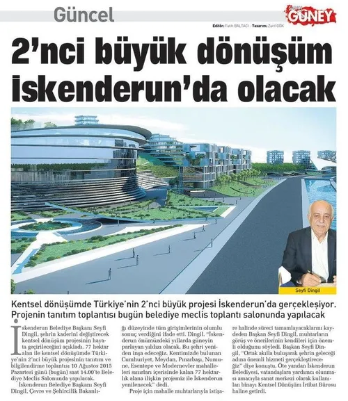 AK Parti hükümetinin İskenderun'da gerçekleştirmek istediği kentsel dönüşümdeki kararlılığı o dönemki gazete kupürlerine de yansıdı. Hükümetin kararlılığı, 7 Ekim 2015 tarihinde yayınlanan "İskenderun'da kenstsel dönüşüm heyecanı" ve 10 Ağustos 2015 tarihli SABAH Gazetesi'nde yer alan "2'nci büyük dönüşüm İskenderun'da olacak" başlıklı haberlerinde açıkça görüldü.