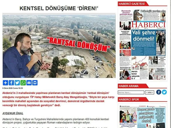 Gece gündüz kara propaganda peşine olan Türkiye İşçi Partisi Hatay Milletvekili Barış Atay'ın 2020 yılında başka bölgelerde yapılacak kentsel dönüşümlere de karşı çıkarak insanları örgütlenmeye davet ettiği görüldü. Atay'ın Mersin ve İstanbul'un Güngören ilçesindeki Küba Mahallesi'nde yapılacak kentsel dönüşümlere karşı çıkarak "Böyle bir şeye karşı kesinlikle mahalleli açısından da sosyalist devrimci, demokrat örgütlerinin de destek vereceği bir direniş başlatmak gerekiyor" dediği belirlendi.