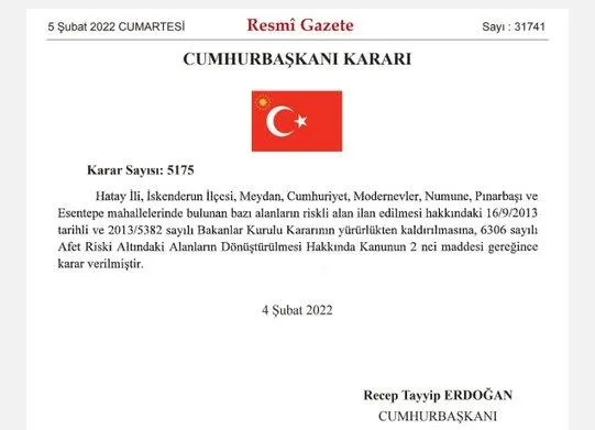 Hatay'ın İskenderun ilçesi sınırlarındaki Meydan Cumhuriyet, Numune, Pınarbaşı, Esentepe ve Modernevler mahallelerinde 786 bin metrekare büyüklüğündeki alan, 16 Eylül 2013'te Bakanlar Kurulu kararı ile 'Riskli Alan' olarak ilan edildi. İskenderun Körfezi ve Çevresi Kentsel Dönüşüm Yenileme İmar ve Kamulaştırma Derneği, radikal sol örgütler ve başını muhtarların çektiği bazı vatandaşlar, onaylı imar planı değişiklikleri ile riskli alanlara ilişkin Bakanlar Kurulu kararını Danıştay'a taşıdı. Bakanlar Kurulu kararı, Danıştay 14. Dairesi'nce durduruldu.