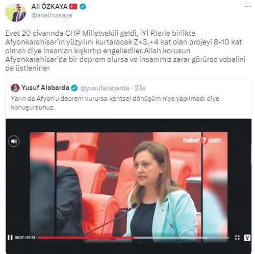 CHP'nin; riskli binaların yıkımını ve kentsel dönüşümü sağlayan 6306 sayılı Afet Riski Altındaki Alanların Dönüştürülmesi Hakkındaki Kanun ile belediyelerin, konut, sanayi ve ticaret alanlarında, kentsel dönüşüm ve gelişim projeleri uygulayabilmesini öngören 5998 sayılı Kanunu'nun iptali için Anayasa Mahkemesi'ne başvurduğu ifade edildi. Afyonkarahisar Merkez'e bağlı Mısri Mahallesi'ndeki kentsel dönüşüm girişimleri de CHP tarafından engellendi. CHP Afyon Milletvekili Burcu Köksal'ın TBMM'de, dönüşümü engellemek için verdikleri mücadeleyi anlatan bir konuşma yapığı da meclis kayıtlarında yer alıyor. AK Parti Afyonkarahisar Milletvekili Ali Özkaya, yapmış olduğu paylaşımda, CHP'nin söz konusu kentsel dönüşümü nasıl engellediğini açıkladı. Özkaya şu ifadeleri kulland: "Evet 20 civarında CHP Milletvekili geldi, İYİ Partililerle birlikte Afyonkarahisar'ın yüzyılını kurtaracak Z+3,+4 kat olan projeyi 8-10 kat olmalı diye insanları kışkırtıp engellediler. Allah korusun Afyonkarahisar'da bir deprem olursa ve insanımız zarar görürse vebalini de üstlenirler."