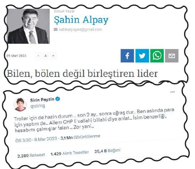 İsim benzerliği, hesabımı çalmışlar falan. Zor yani." Oyuncu Yunus Günçe: "Troller troller troller. Troller Alman futbolcu. Bence artık siz kendinize başka işler bakın. Başka kariyerler planlayın. Çünkü artık buradan size ekmek çıkmaz... 15 Mayıs sabahı alayınız resmen çöpsünüz. Zaten çöpsünüz ya neyse. Yani ne yazarsanız yazın kime ne b..k atarsanız atın sonuca etki etmeyecek. Yani diyorum ki g...nüzü yırtsanız olmayacak. Limon satabilirsiniz pazarda. Korsan taksici olun, Rusya ile fason penye işi yapın ya da p...k olun..." FETÖ'ye ait kapatılan Zaman gazetesi yazarlarından Şahin Alpay: "Umarım 14 Mayıs 2023 gecesi birleştiren politikanın kazandığını göreceğiz. Umudumuz Kılıçdaroğlu." -