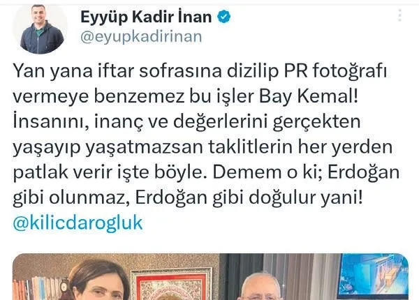 Millet ittifakı'nın cumhurbaşkanı adayı Kemal Kılıçdaroğlu, İstanbul platformunun düzenlediği iftar programına katıldı. Programın ardından CHP Düzce Milletvekili aday adayı Azade Ay ile CHP'li Canan Kaftancıoğlu'nun da katıldığı bir görüşme gerçekleştirdi. Görüşmede çekilen fotoğrafta Kılıçdaroğlu ve ekibinin ayakkabıları ile seccade üzerinde verdiği poza tepki çığ gibi: Akademisyen Emrah Gülsunar: İstediğin kadar 'helalleşme' de. Dini değerlere hassas olan seccadeyi fark eder. AK Parti Gençlik Kolları Başkanı Eyyüp Kadir İnan: İftar sofrasına dizilip PR fotoğrafı vermeye benzemez bu işler Bay Kemal! Taklitler böyle patlar.