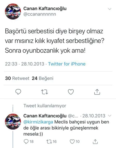 • Kaftancıoğlu: "Başörtüsü serbestisi diye bir şey olmaz. Var mısınız kılık kıyafet serbestliğine? Sonra oyunbozanlık yok ama! Meclis bahçesi uygun. Ben de öğle arası bikiniyle güneşlenmek mesela:))"