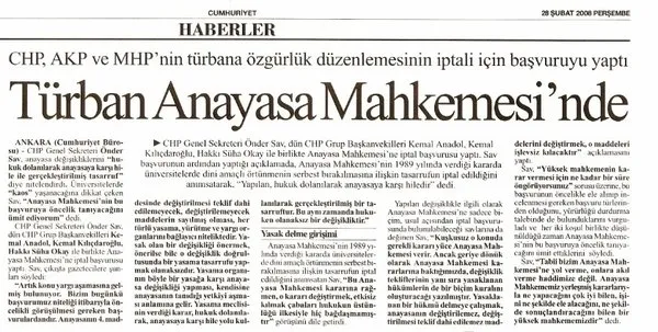 • SSK Genel Müdür Kılıçdaroğlu'nun talimatıyla, Kırklareli'nde peruklu türbanla duruşmaya giren Öznur Toptaş, Konya'da türbanla duruşmaya girmekte direnen Nadire Boyalı Zengin, Şengül Kara, Zeynep Ümit Altınsay, Erzurum'da Züheyde Boncukoğlu hakkında soruşturma başlatıldı. (18 Şubat 1998)