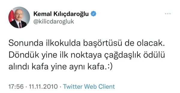 • Kılıçdaroğlu, AK Parti'nin ilkokullarda başörtüsü yasağının kaldırılması için başlattığı çalışmayı hafife aldı. Tweetinde başörtüsünü çağdaşlığa aykırı bir durum olarak yorumladı.