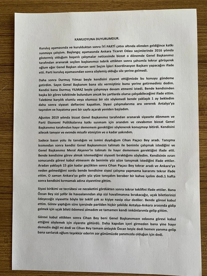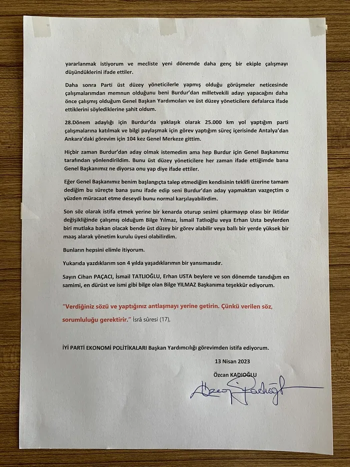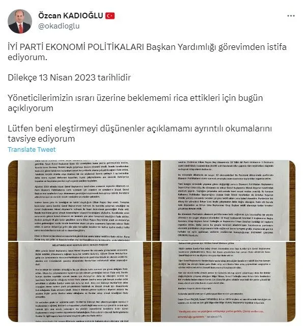 Özcan Kadıoğlu "İYİ Parti Ekonomi Politikaları Başkan Yardımcılığı görevimden istifa ediyorum. Dilekçe 13 Nisan 2023 tarihlidir. Yöneticilerimizin ısrarı üzerine beklememi rica ettikleri için bugün açıklıyorum. Lütfen beni eleştirmeyi düşünenler açıklamamı ayrıntılı okumalarını tavsiye ediyorum" ifadelerini kullandı.