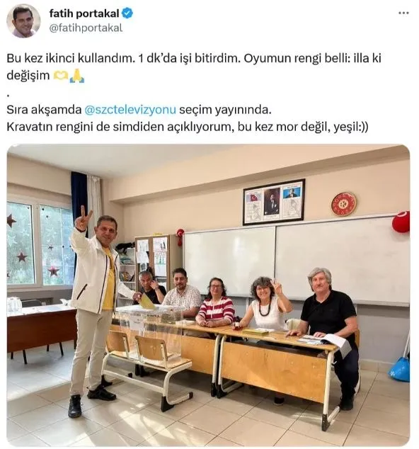 İzmir'in Seferihisar ilçesinde, Cumhurbaşkanı Seçimi ikinci turunda oy kullandığı zarfı sandığa atarken "zafer işareti" yapıp fotoğraf çektiren sunucu Fatih Portakal ve Yeşil Sol Parti sandık kurulu üyesi Y.D. hakkında suç duyurusunda bulunuldu.