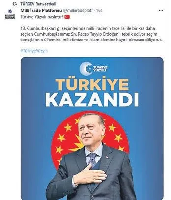 Türkiye Gençlik ve Eğitime Hizmet Vakfı (TÜRGEV): Türkiye Yüzyılı Başlıyor! 13. Cumhurbaşkanlığı seçimlerinde milli iradenin tecellisi ile bir kez daha seçilen Cumhurbaşkanımız Sn. Recep Tayyip Erdoğan'ı tebrik ediyor, seçim sonuçlarının ülkemize, milletimize ve İslam âlemine hayırlı olmasını diliyoruz.