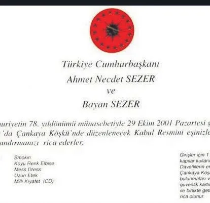 Türkiye'nin 10. Cumhurbaşkanı Ahmet Necdet Sezer, 29 Ekim 2001 tarihinde 'Türkiye Cumhurbaşkanı' ifadesinin yer aldığı davetiyeyle cumhuriyetin 78. yılı dolayısıyla konuklarını Çankaya Köşkü'ne davet etti.