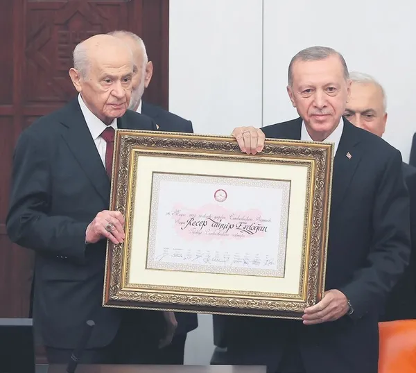 TBMM'de önceki gün vekillerin yemin etmesinin ardından dün de tarihi bir gün yaşandı. 28 Mayıs seçimlerinde halkın bir kez daha desteğini alarak zafer kazanan Başkan Erdoğan, Türkiye Yüzyılı vizyonuyla yola devam etmek amacıyla TBMM'de 5 yıllık dönem için yemin etti. Törenden hemen önce Meclis'e gelen Erdoğan'ı Geçici Meclis Başkanı Devlet Bahçeli resmi törenle karşıladı. Tören kıtasını selamlayan Erdoğan, Meclis Şeref Holü'ne geçti. Erdoğan'a Genel Kurul'a gelişinde Geçici TBMM Başkanı Devlet Bahçeli, Cumhurbaşkanı seçilmesine ilişkin mazbatasını verdi. Cumhur İttifakı partilere mensup milletvekilleri ile Genel Kurul'da bulunan izleyiciler dakikalarca ayakta alkışladı.