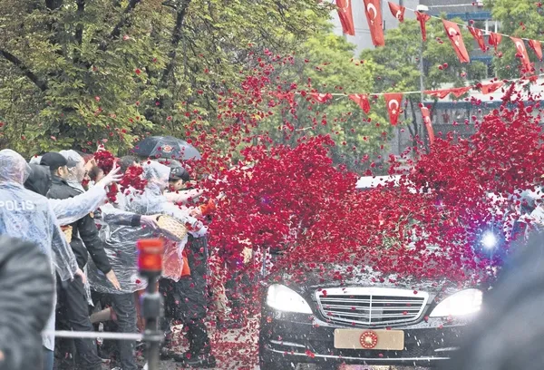 Başkan Erdoğan'ın Külliye'den çıkan aracına TBMM yolu boyunca geniş bir motosikletli polis konvoyu eskortluk yaptı. Erdoğan, Meclis'e gelirken vatandaşların büyük sevgisiyle karşılandı, aracının üstüne karanfil atıldı. Göreve başlama töreni için Külliye'ye girerken yurt genelinde garnizonlarda 101 pare top atışı yapıldı.