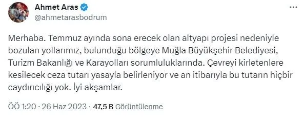 Dünyanın en önemli tatil merkezlerinden biri olan Bodrum'da belediyecilik çalışmaları ise sınıfta kaldı. Vatandaşların şikayet ettiği bozuk yollar hakkında sosyal medyadan paylaşım yapan Bodrum Belediye Başkanı Ahmet Aras, sorumluluğun Muğla Büyükşehir Belediyesi ve Kültür Ve Turizm Bakanlığı'nda olduğunu iddia etti.