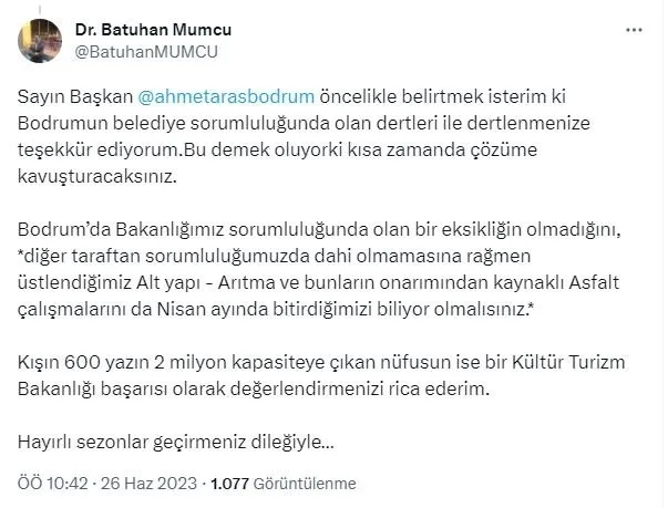 Aras'ın sosyal medya üzerinden yaptığı paylaşıma cevap veren Kültür Ve Turizm Bakan Yardımcısı Dr. Batuhan Mumcu şu açıklamaları yaptı: