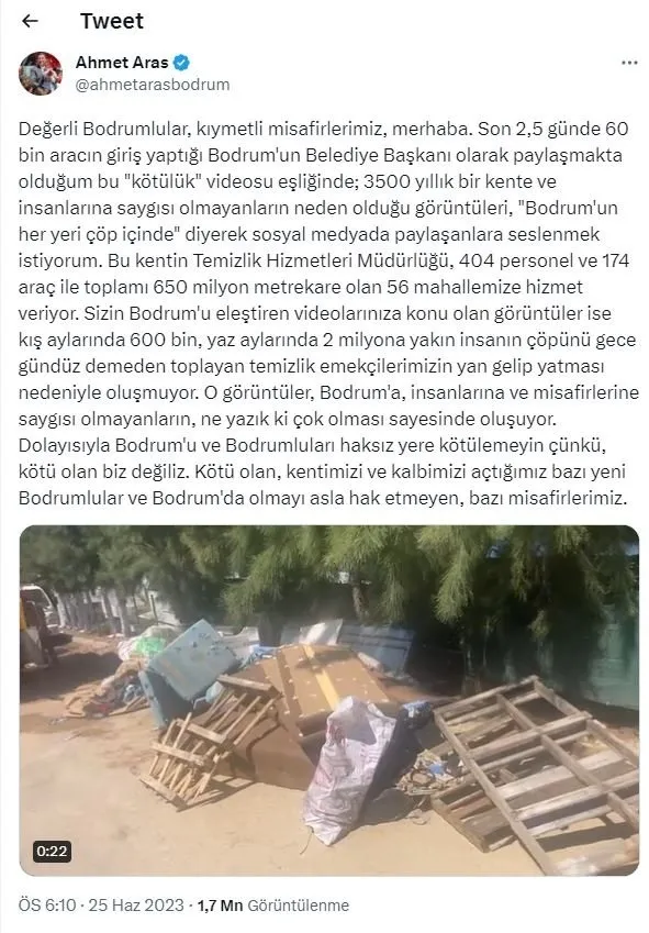 Bayramla birlikte ziyaretçi akınına uğrayan Bodrum'da yaz sezonunun açılmasına rağmen bozuk olan yolları ve etraftaki çöp yığınları büyük tepkilere neden olmuştu. Konunun muhatabı değilmiş gibi davranan ve algı operasyonuna girişen Bodrum Belediye Başkanı Ahmet Aras'a, Kültür Ve Turizm Bakanlığı'ndan yanıt geldi.